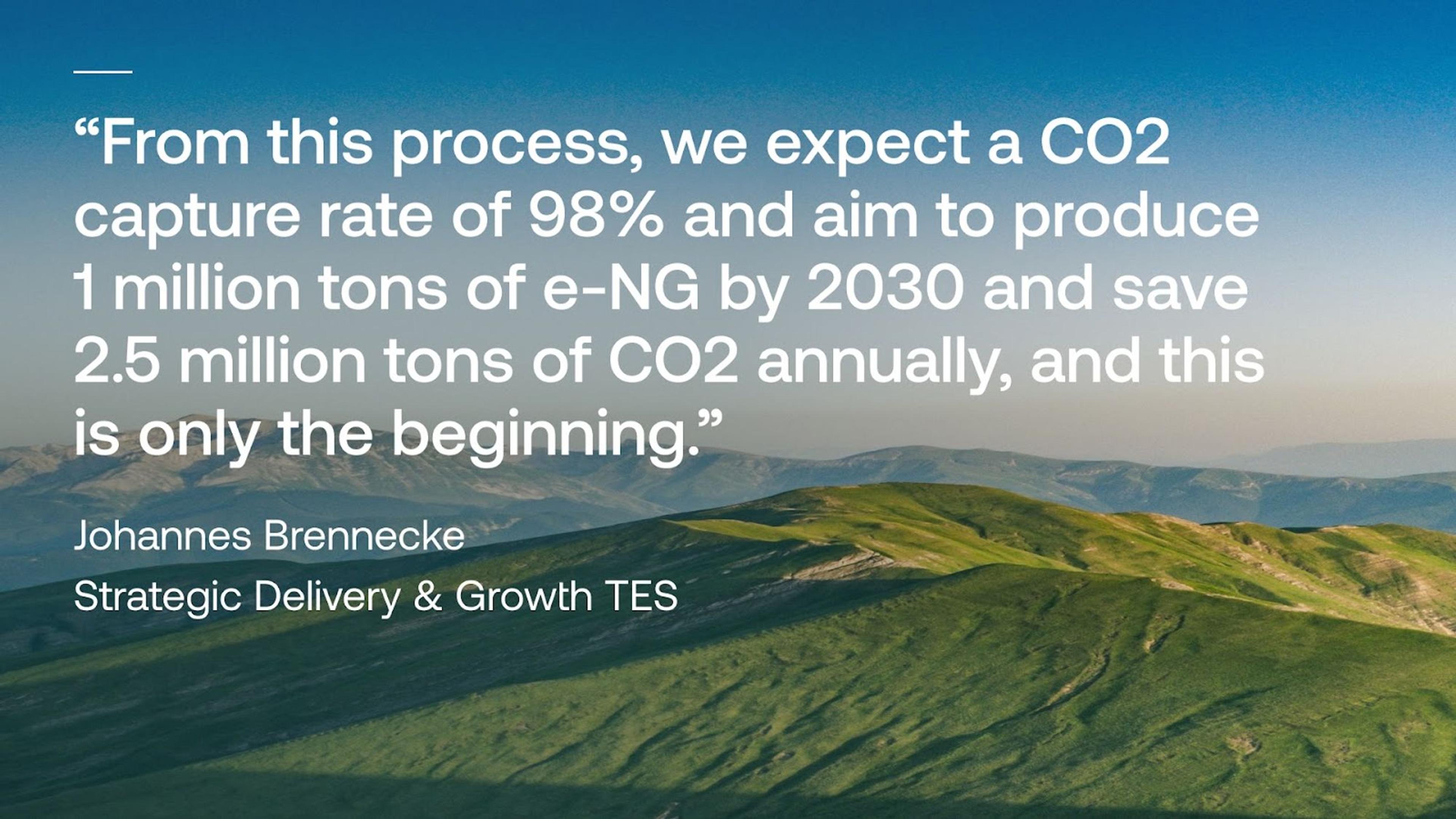 From this process, we expect a CO2 capture rate of 98% and aim to produce 1 million tons of e-NG by 2030 and save 2.5 million tons of CO2 annually, and this is only the beginning. To make it fully sustainable we will use CO2 from biogenic sources or Direct Air Capture, to make up for the 2% we can’t capture.