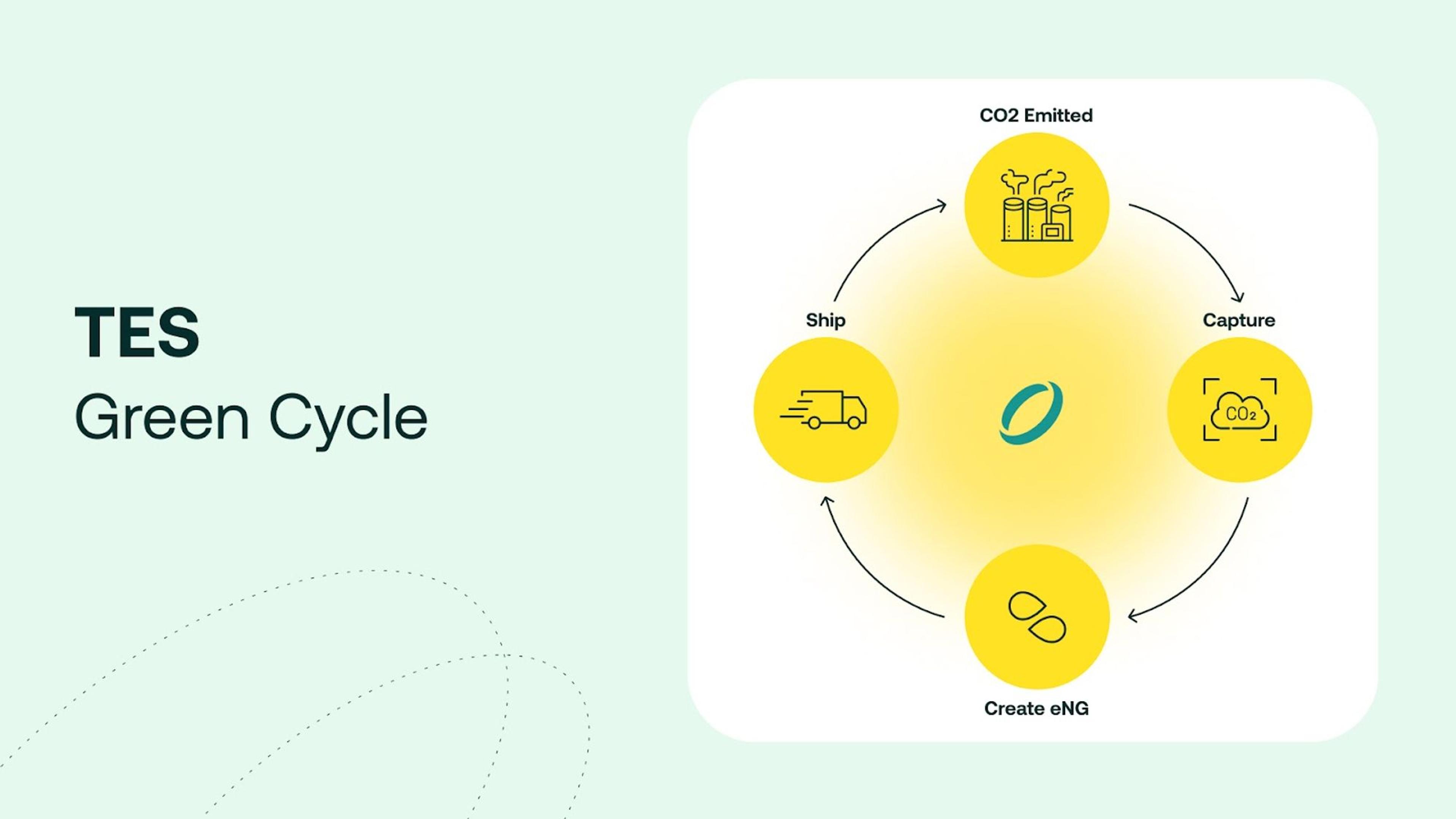 At TES we go one step further to close the carbon loop. Before the CO2 is emitted at the end of the last step, we capture it and ship it back so that it can be recycled with green hydrogen to create e-NG. CO2 is never emitted into the air but kept in our Green Cycle.
