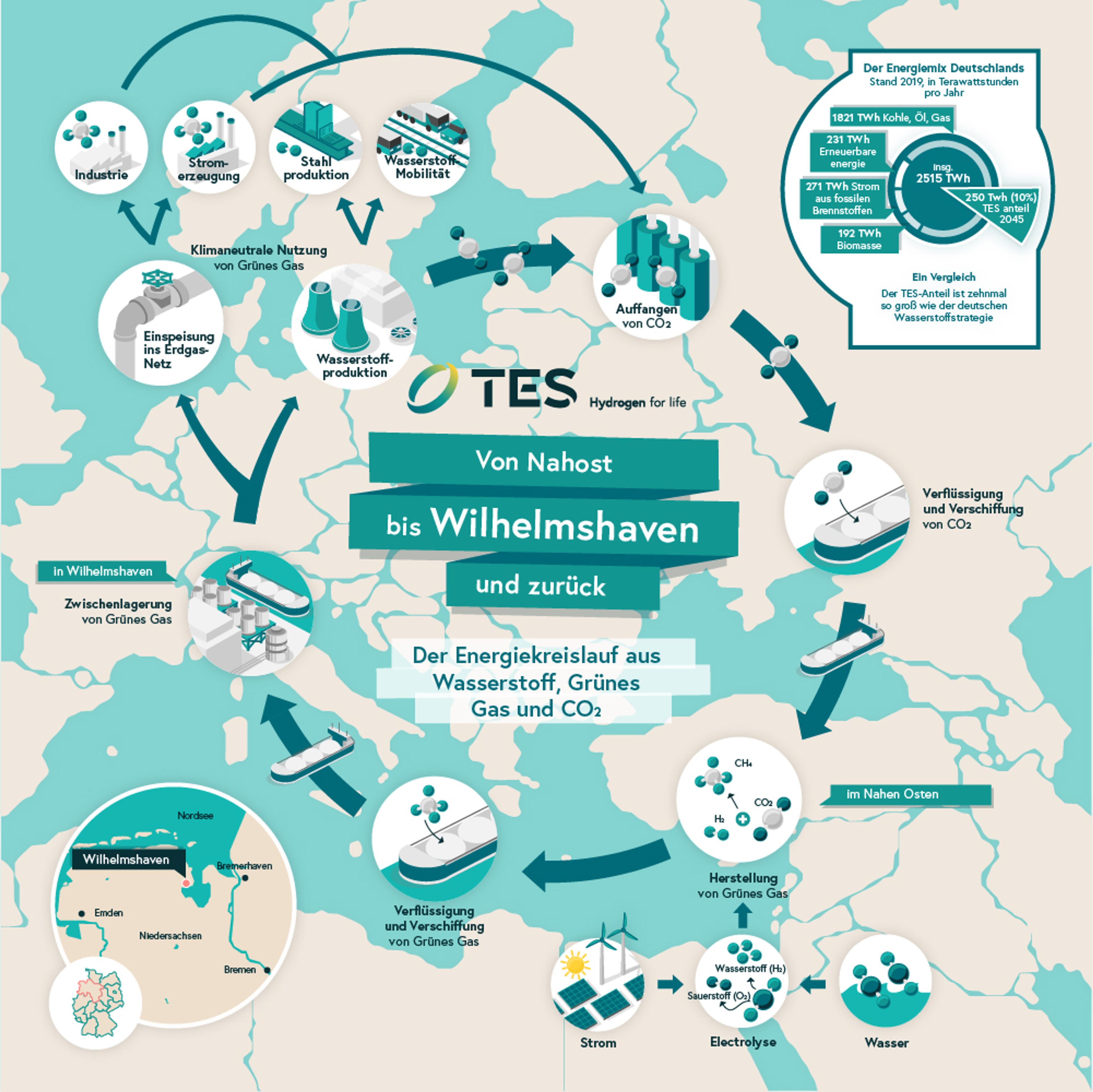TES Grüner Wasserstoff wird hauptsächlich mit Solar-, Wind- und Wasserkraft in Ländern mit sehr gut verfügbaren erneuerbaren Energiequellen hergestellt, wonach dem Wasserstoff dann CO₂ hinzugefügt wird, um grünes CH4 herzustellen, das als „Energieträger“ verwendet wird. Diese wird dann mit einer eigens konstruierten Flotte von Schiffen nach Wilhelmshaven transportiert. In Wilhelmshaven kann das grüne CH4 wieder in grünen Wasserstoff umgewandelt werden, wobei das entstehende CO₂ abgeschieden und in einem kontinuierlichen geschlossenen Kreislaufsystem per Schiff in die Erzeugerländer zurückgeführt wird – so garantieren wir, dass das CO₂ niemals den Kreislauf verlässt und vermeiden THG-Emissionen.